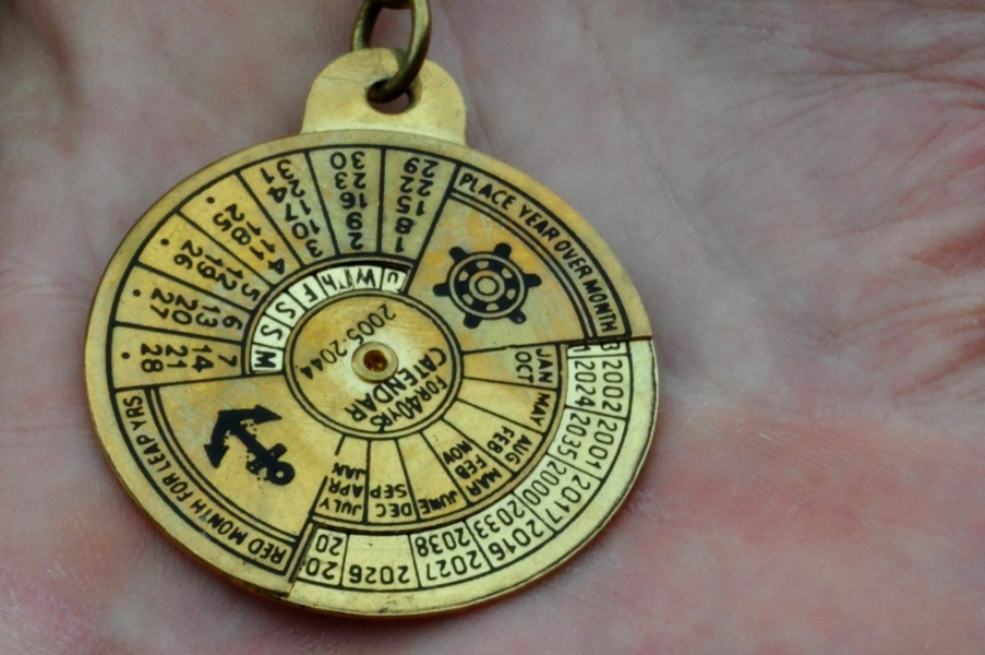Mamy w domu jeszcze jeden wyjątkowy kalendarz, który kupiliśmy kiedyś w Antwerpii. To tak zwany wieczny kalendarz, ale tak naprawdę to kalendarz na lata 2005 – 2044. Jest to breloczek z ruchomą tarczą, która pozwala odczytać każdy dzień tygodnia do roku 2044. Ten kalendarz to taki gadżet, ale całkiem przydatny, bo jeśli chcemy sobie zaplanować coś wyjątkowego z dużym wyprzedzeniem i chcemy wiedzieć, jaki to będzie dzień tygodnia na przykład z okazji okrągłych urodzin za kilka lat to ten kalendarz, jest jak znalazł.